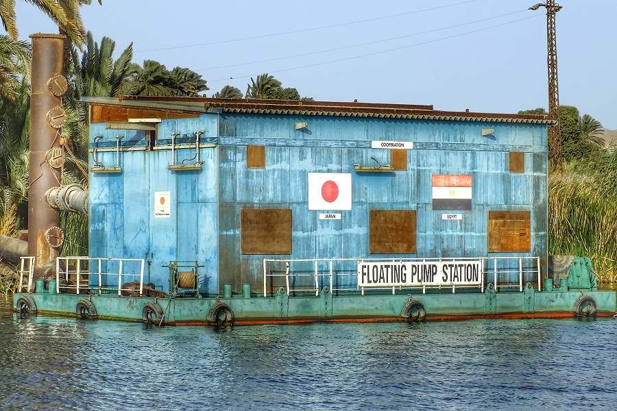 Entlang der Nilufer sieht man schwimmende Pumpstationen, die die Felder der Umgebung mit Wasser versorgen ...
