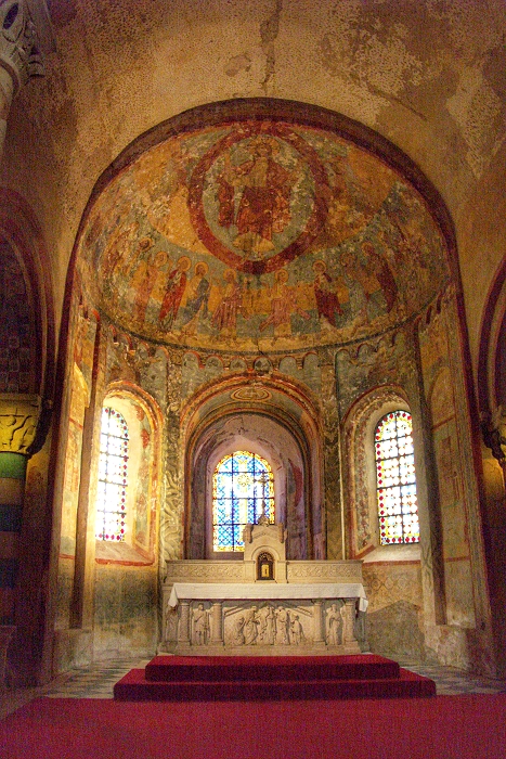 Die Chorapsis der Priorei St. Trinité wird von einer Halbkuppel überwölbt, die mit Fresken aus dem 12. Jahrhundert ausgemalt ist und die Himmelfahrt Christi zeigt ...