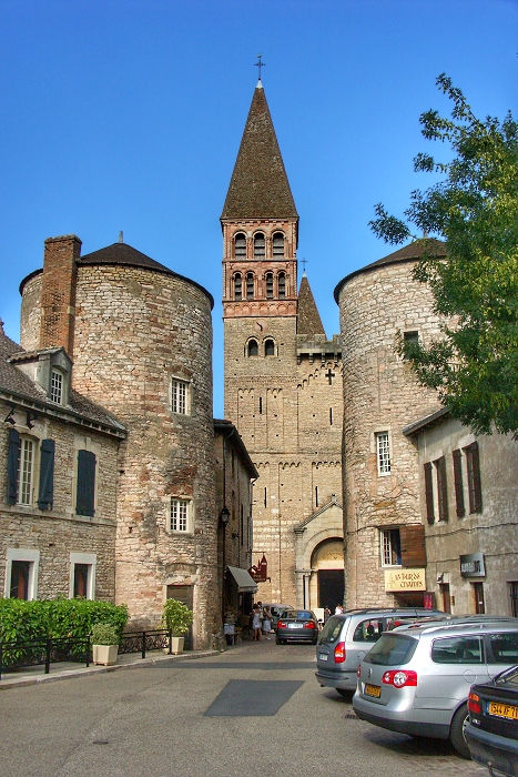 Hinter den beiden Rundtürmen der alten Befestigung erhebt sich die romanische Westfassade von St. Philibert in Tournus ...