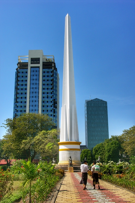 Rangoon: Im Zentrum des Maha Bandoola Parks steht das Denkmal für die Unabhängigkeit, ein 46 m hoher Obelisk, der von 5 Statuen umgeben ist, die die ehemaligen 5 burmesischen Staaten der Shan, Kachin, Karen, Kayah und Chin symbolisieren ...