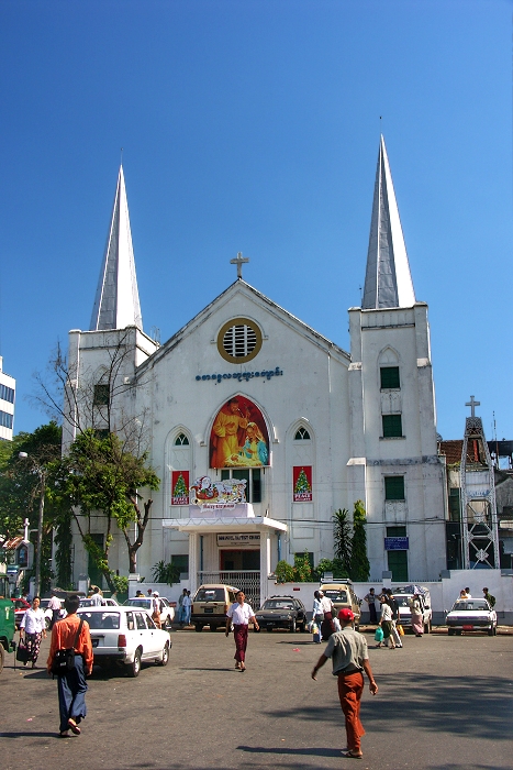 Gegenüber dem Rathaus von Rangoon liegt die Baptistenkirche mit ihren markanten Doppeltürmen ...