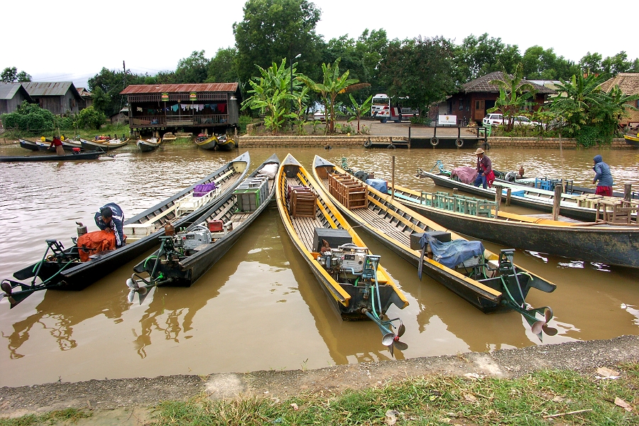Am Hauptkanal in Nyaungshwe liegen die schnellen Longtail-Boote, die die Touristen hinaus auf den See bringen ...