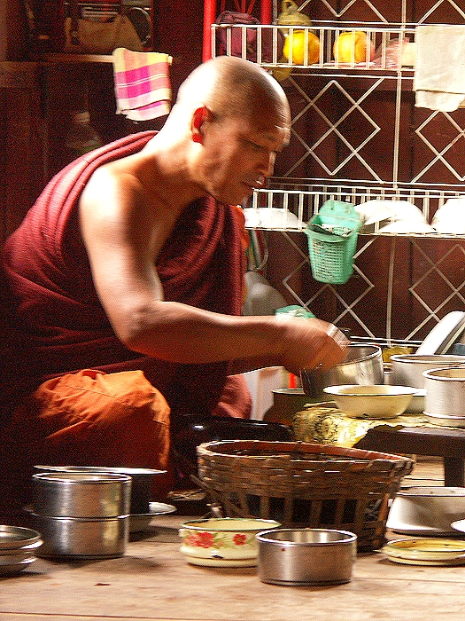 Mönch in einem kleinen Kloster bei Indein beim Mittagessen ...