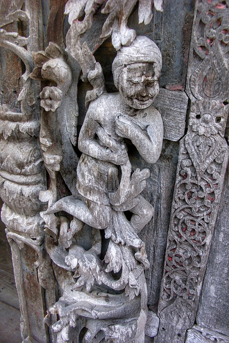 Die Wände des Shwenandaw Klosters sind mit kunstvoll geschnitzten Figuren verziert ...