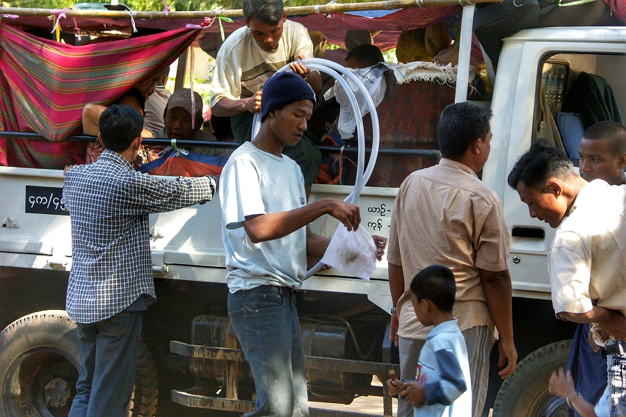 Ein burmesischer Kleinlaster, auf dessen Ladefläche die Menschen wie Vieh transportiert werden, wird mangels einer Tankstelle aus einem eigens mitgeführten Benzinfass mithilfe eines Schlauchs und Trichters betankt ... | |