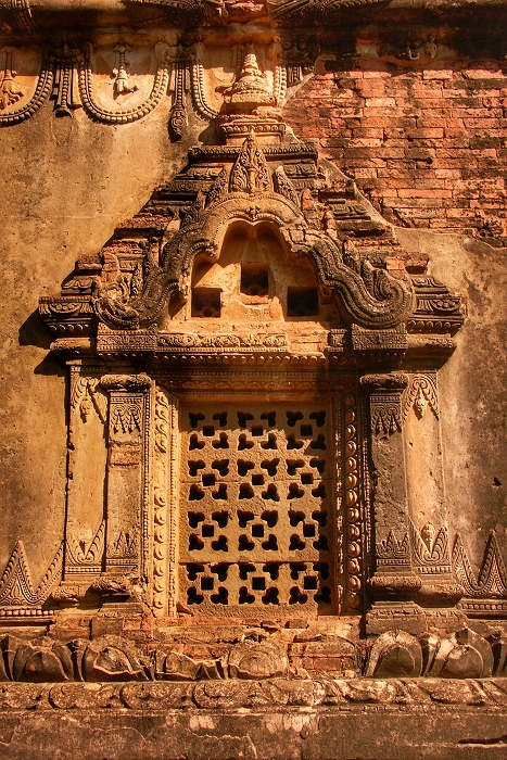 Filigrane Reliefs zieren die Einfassungen der Fenster des Gubyaukgyi Tempels ...