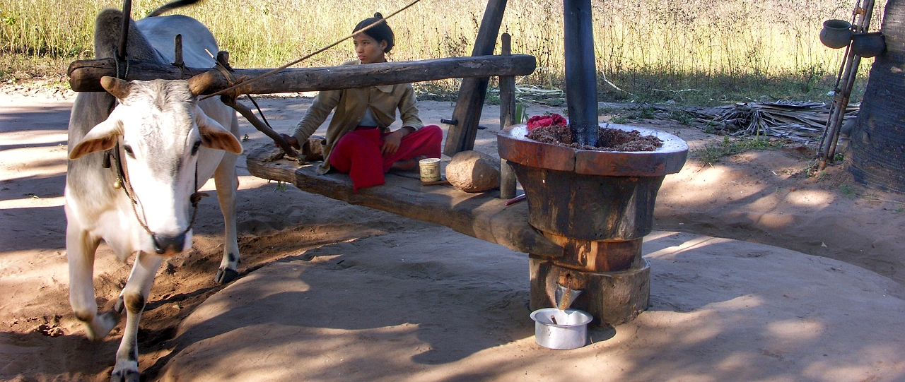 Ländliches Myanmar: altertümliche Ölmühle ...