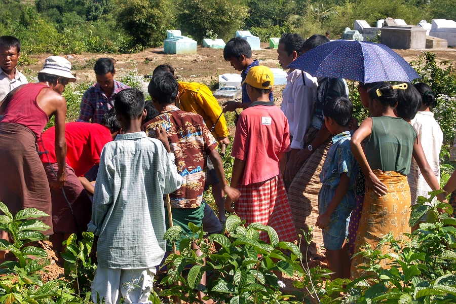 Die Trauergemeinde ist auf dem Friedhof eingetroffen und schart sich um das offene Grab ...