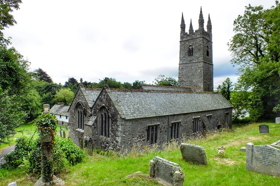 Die Kirche von Poundstock liegt abseits der Hauptstraße in einer Senke zwischen Bäumen versteckt ...