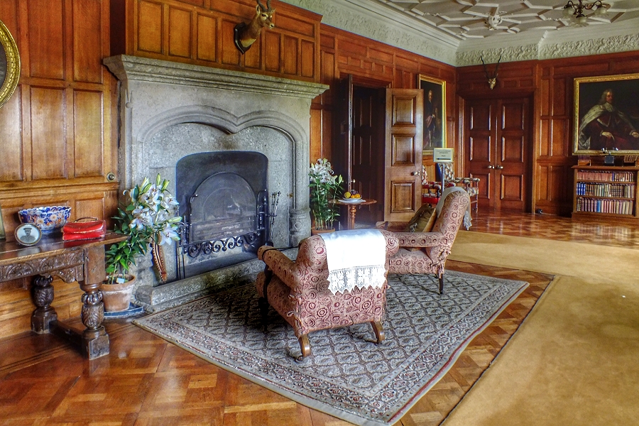 Lanhydrock House: Außenhalle mit viktorianischer Stuckdecke und einer Täfelung aus dem Jahre 1880 ...