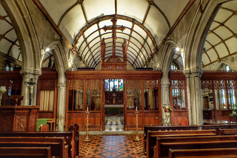Inneres der Kirche von St Neot: Tonnengewölbe des 15./16. Jahrhunderts und Chorschranke des 19. Jahrhunderts ...