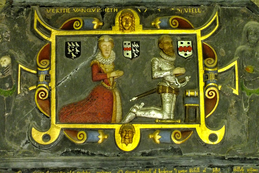 Detail des kolorierten Schiefermonuments in der Kirche von St Breock ...