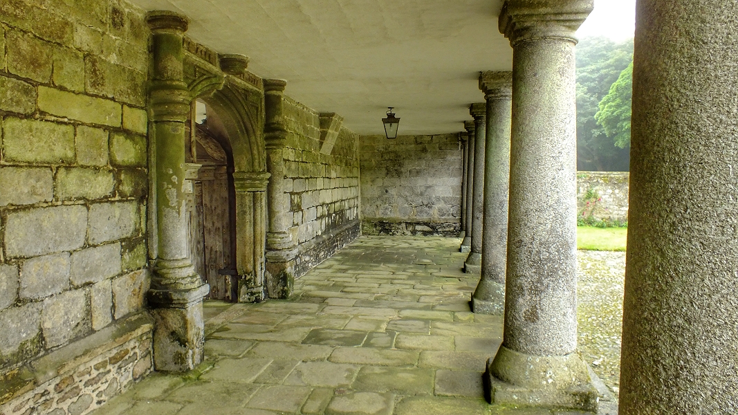 Die Kolonnade der Nordfassade von Godolphin House wurde 1635 über dem Eingang aus elisabethanischer Zeit errichtet ...