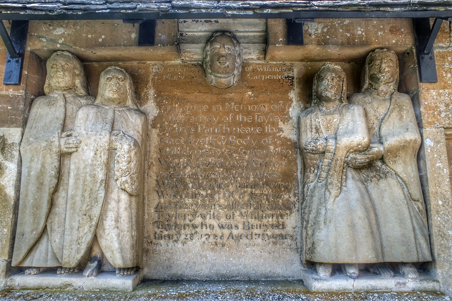 Gedenktafel des 18. Jahrhunderts für eine ganze Familie an der Kirche von Little Barrington: William Tayler sen. (+1699), seine Frau Elizabeth (+1726) sowie seine Kinder William jr. (+1702) und Elizabeth (+1733) ... | |