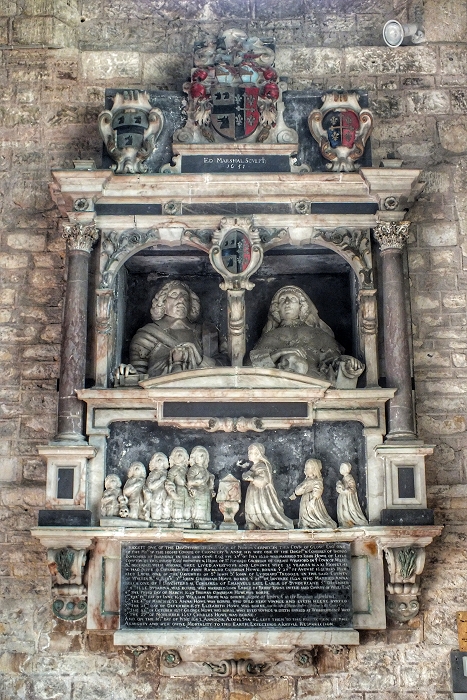 Grabmal für den Parlamentarier und High Sheriff von Gloucestershire Sir John Howe, 1. Baronet (+1671) und seine Frau Lady Bridget Howe née Rich (+1642) von Cassey Compton in der Kirche von Withington ...