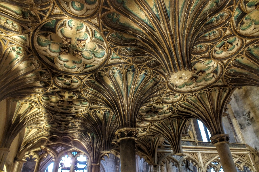 Spätgotisches, ursprünglich farbiges Fächergewölbe in der Beauchamp-Warwick Votivkapelle von Tewkesbury ...
