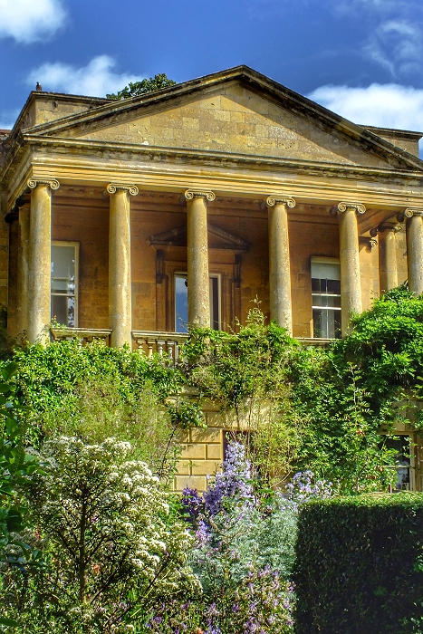 Die georgianische Fassade von Kiftsgate Court House aus dem 18. Jahrhundert mit ihrem klassischen Portico war ursprünglich ein Teil von Mickleton Manor und gelangte erst nach dessen Abriss hierher ...