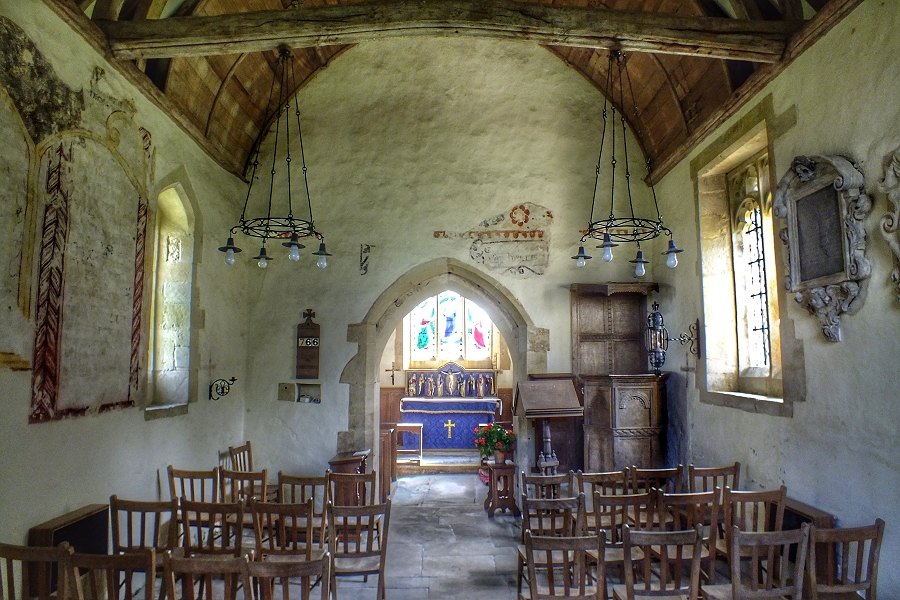 St Mary's, Shipton Sollars: Tonnengewölbe sowie Reste von Wandmalereien aus dem 14. und 15. Jahrhundert ...