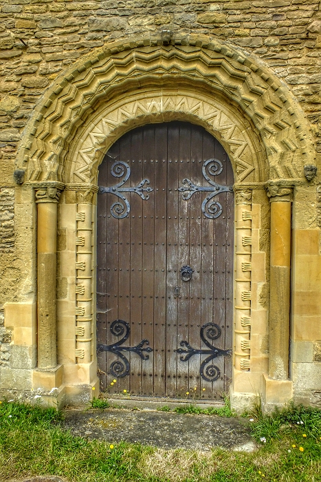 Normannische Priesterpforte mit schöner Zickzackdekoration im Bogen an der Pfarrkirche von Bampton ...
