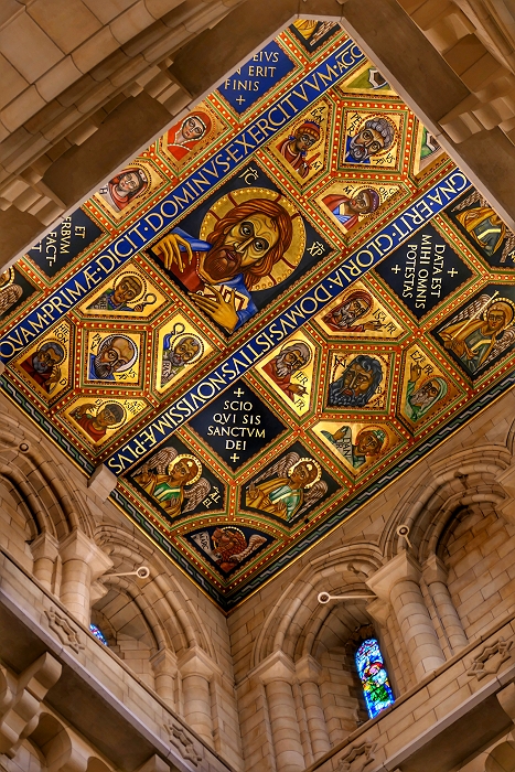 Buckfast Abbey: Die Decke des Vierungsturmes wurde von den Mönchen im byzantinischen Stil ausgemalt, und teilvergoldet ...