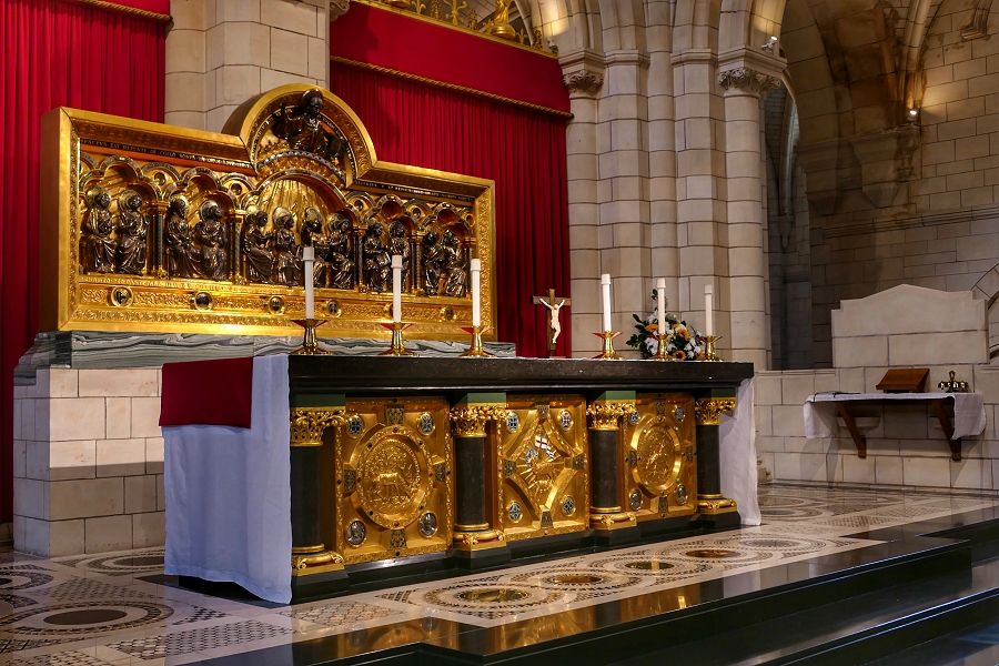 Der Altar der Abteikirche Buckfast wurde aus schwarzem belgischen Marmor angefertigt. Die Bildwand dahinter, eine Kopie des Retabel von Koblenz aus dem 12. Jahrhundert (heute im Musée de Cluny), zeigt die Herabkunft des Heiligen Geistes ... | |