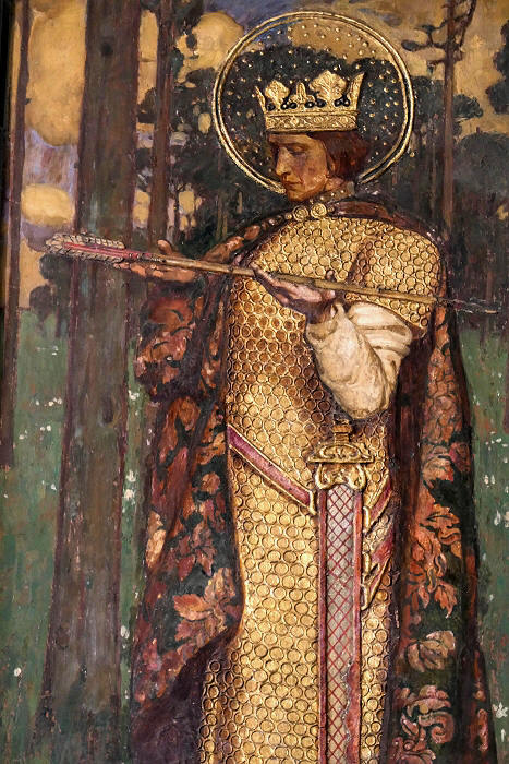 Abtei von Wymondham: Darstellung des heiligen Edmund, im 9. Jahrhundert König von East Anglia, auf einem der Seitenflügel des Triptychons ...