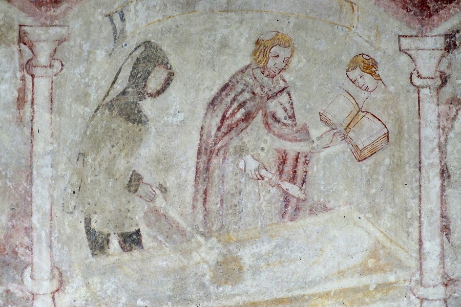 Mittelalterliche Fresken in der Kirche von Wickhampton zeigen die 'Seven Acts of Mercy' ...