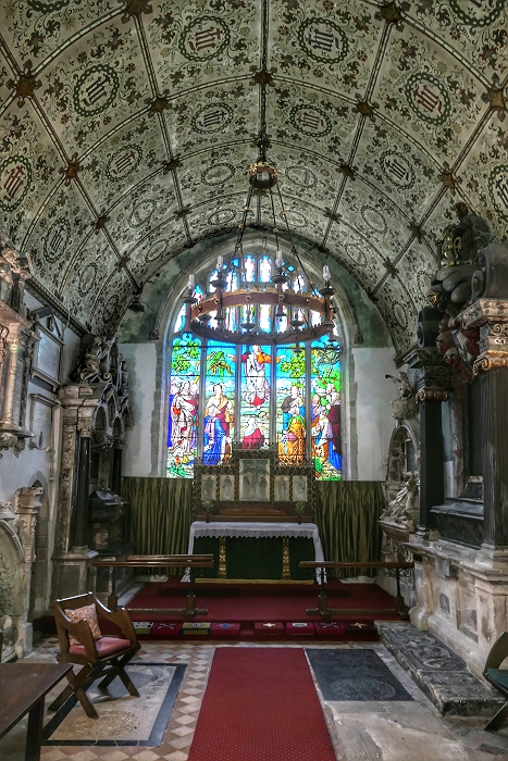 Im 19. Jahrhundert wurde die Kirche All Saints in Hawstead im Sinne des High Church Ritus umfassend restauriert und das Tonnengewölbe des Chores mit Marianischen Monogrammen verziert ...
