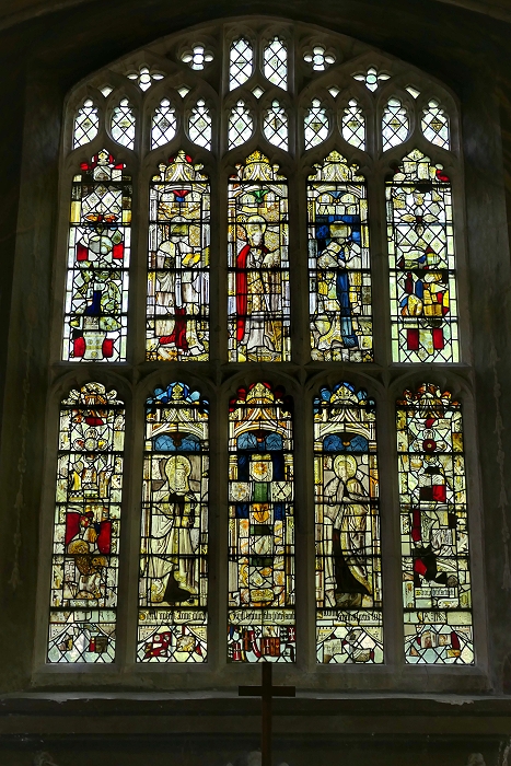 Das Ostfenster der Kapelle Gipping St Nicholas enthält noch Glas aus der Zeit um 1500, das allerdings aus mehreren Fenstern zusammengestellt wurde und zum Teil nur fragmentarisch erhalten ist ...
