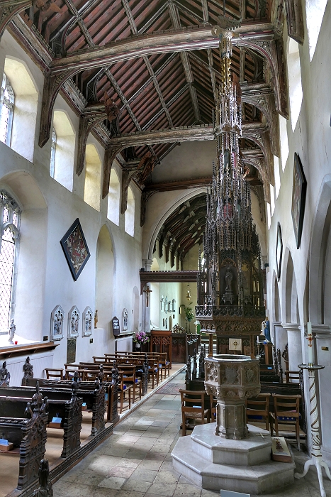 Glanzstück der Kirche St Mary's, Ufford ist jedoch der Taufbrunnen mit einer geschnitzten Haube von ca. 1450, die zu den schönsten des Landes zählt ...