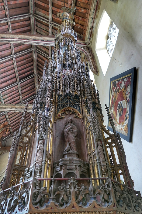 Haube des Taufbrunnens ist überreich mit Fialen, Krabben und