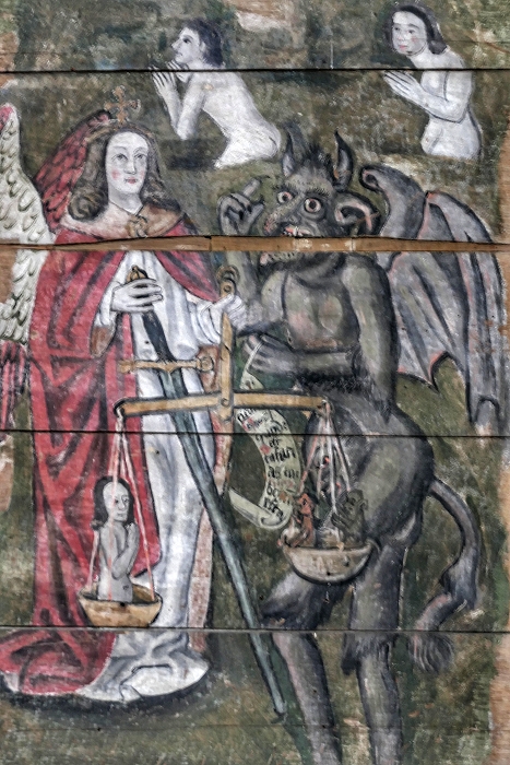 St Peter's, Wenhanston: Im unteren Teil des 'Doom Boards' sieht man den Erzengel Michael mit der Waage der Gerechtigkeit, auf der die Taten der Verstorbenen gewogen werden, sowie den Satan mit Hörnern und Fledermausflügeln ...