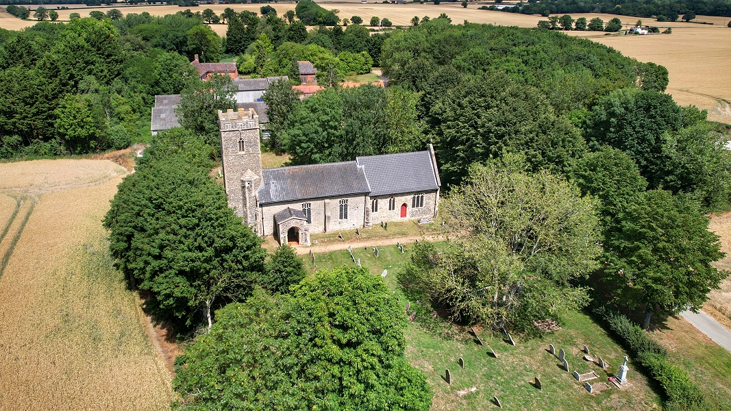 St Margaret's church in Tivetshall St Margaret liegt außerhalb des Dorfes neben einer Farm inmitten von Feldern ...