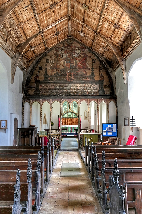 Im Inneren der Kirche St Margaret's ist die Teilung zwischen Chor und Schiff noch augenscheinlicher wegen des Chorbogens mit Schranke und gut erhaltenem Tympanon, einer Seltenheit, da diese meistens in der Reformation entfernt wurden ...