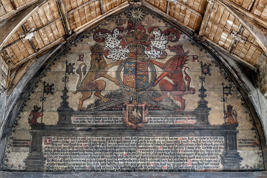 Das elisabethanische Wappen auf dem Tympanon der Chorschranke von St Margaret's ist eine ausgesprochene Seltenheit und wurde 1587, im Jahr vor dem Angriff der Spanischen Armada gemalt, in einer Zeit, da England von Verschwörungen gegen die Königin erschüttert wurde, was auch die Inschrift 'O God save our Queene Elizabeth' erklären mag ... | |