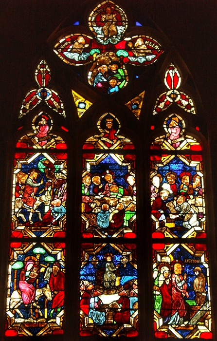 Besonders schön sind die gut erhaltenen, in der Art von 'Bilderbibeln' gestalteten mittelalterlichen Glasfenster der Kirche von Niederhaslach ...