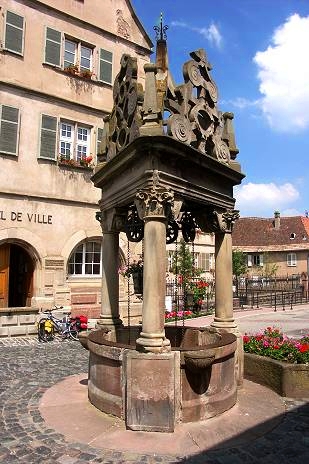 Vor dem Rathaus in Boersch steht einer der im Elsass weit verbreiteten Sechseimerbrunnen ...