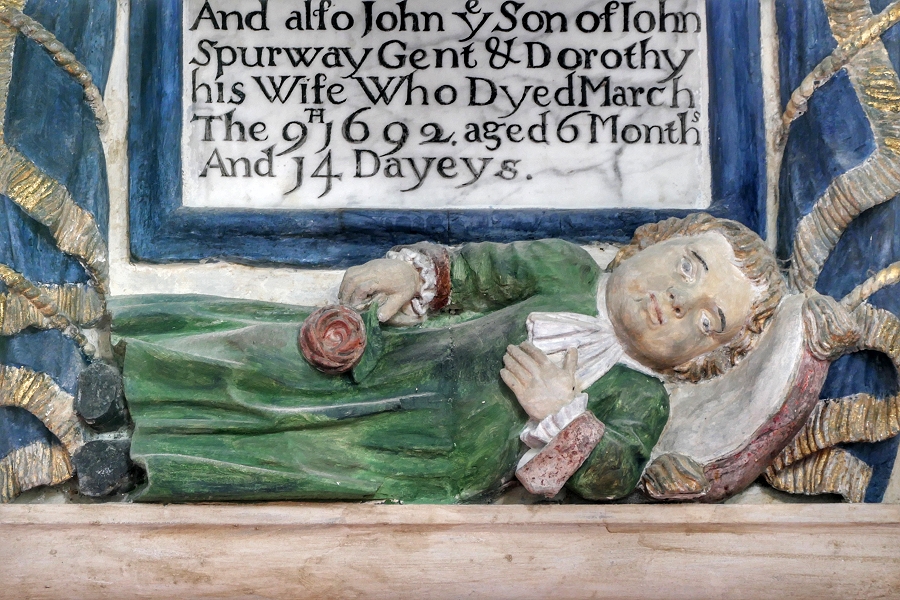 St Peter's, Oakford: Epitaph für John und Margarett Spurway (Detail) ...