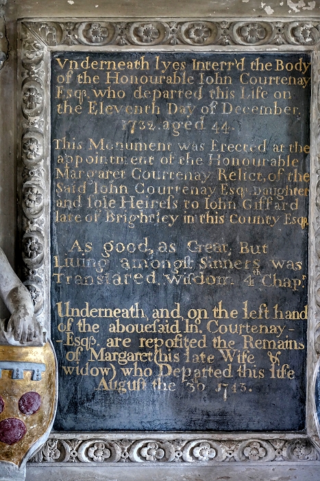Inschrift auf dem Grabmal für John V. Courtenay Esq. (1687-1732), dem 3. und ältesten überlebenden Sohn von John IV. Courtenay und letzten männlichen Vertreter der Courtenays of Molland ...