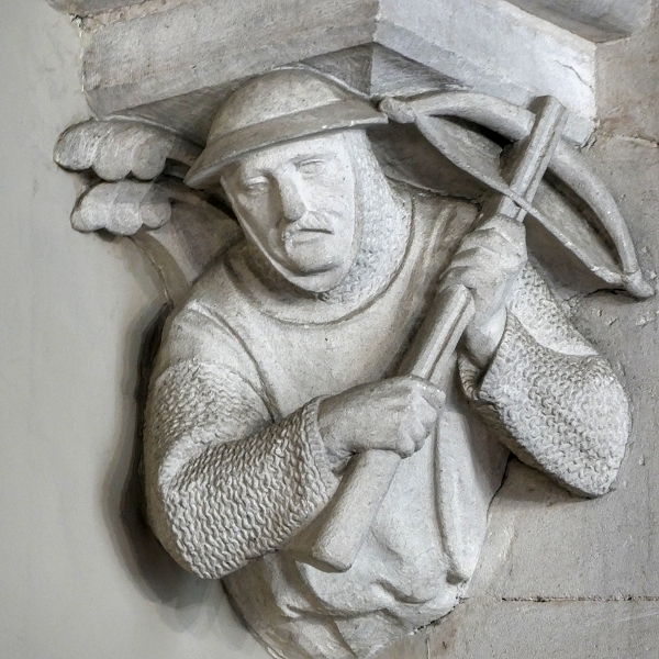 In der Halle von Knightshayes werden die Kragsteine, auf denen das Balkendach ruht, von figürlichen Darstellungen gestützt ...