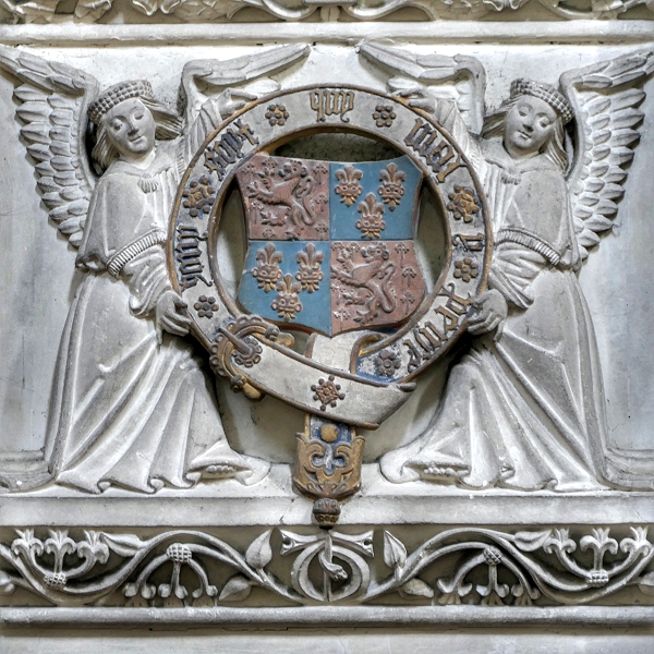 Boxgrove Priory: Engel tragen die dynastischen Wappen der Familie de la Warr an der Chantry Chapel ...