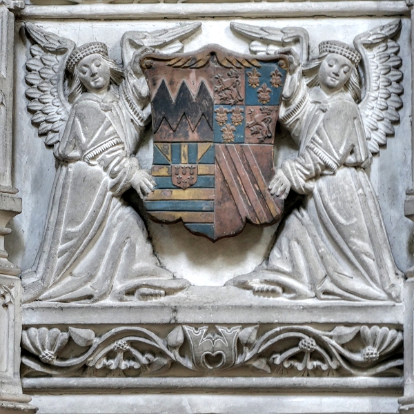 Boxgrove Priory: Engel tragen die dynastischen Wappen der Familie de la Warr an der Chantry Chapel ...