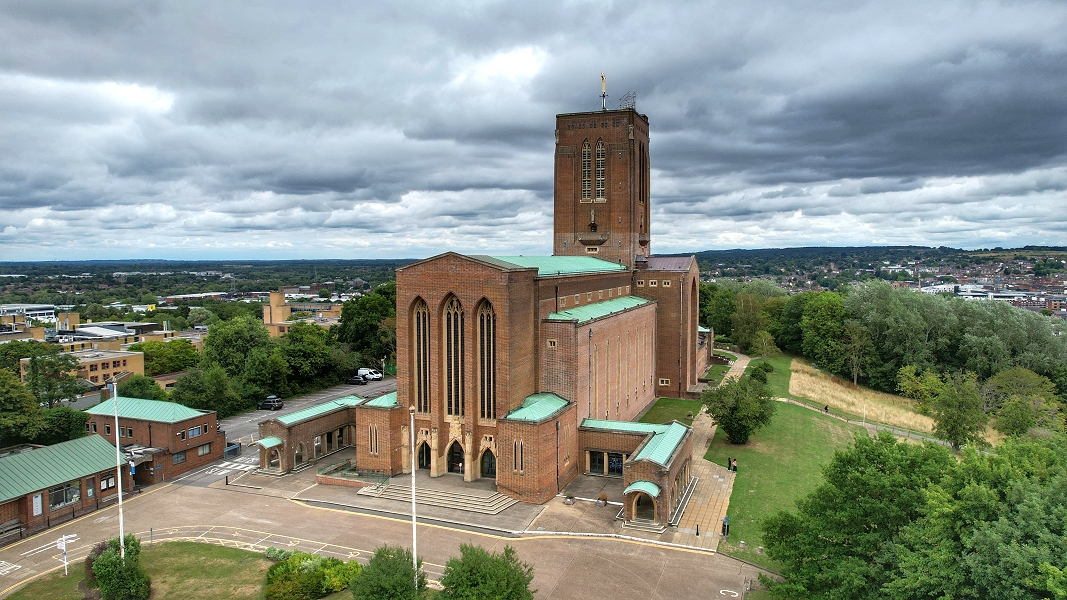 Die Kathedrale von Guildford liegt auf einem Hügel oberhalb der Stadt ...