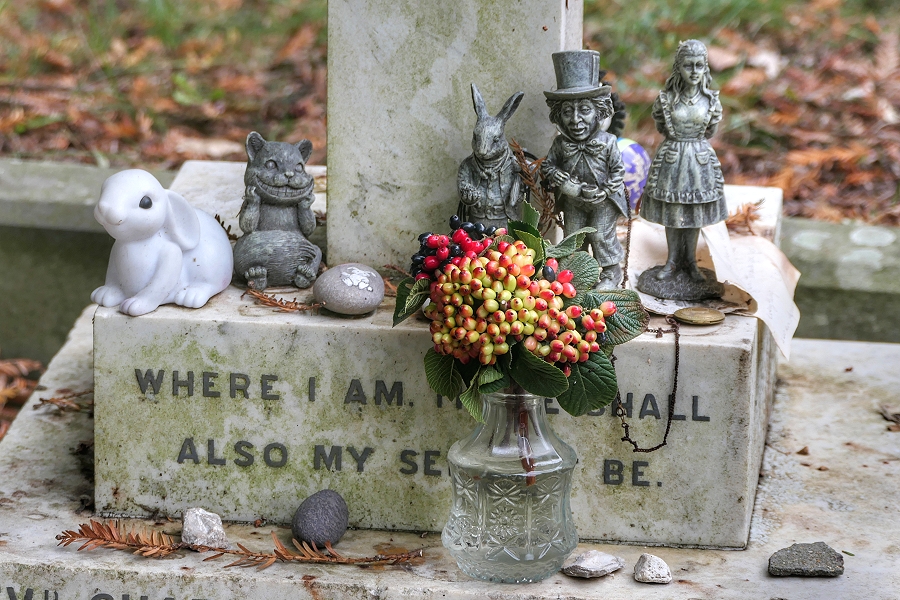 Verehrer von Lewis Carroll dekorieren sein Grab immer wieder mit Figuren der einschlägigen Charaktere aus seinem Buch 'Alice im Wunderland' ...