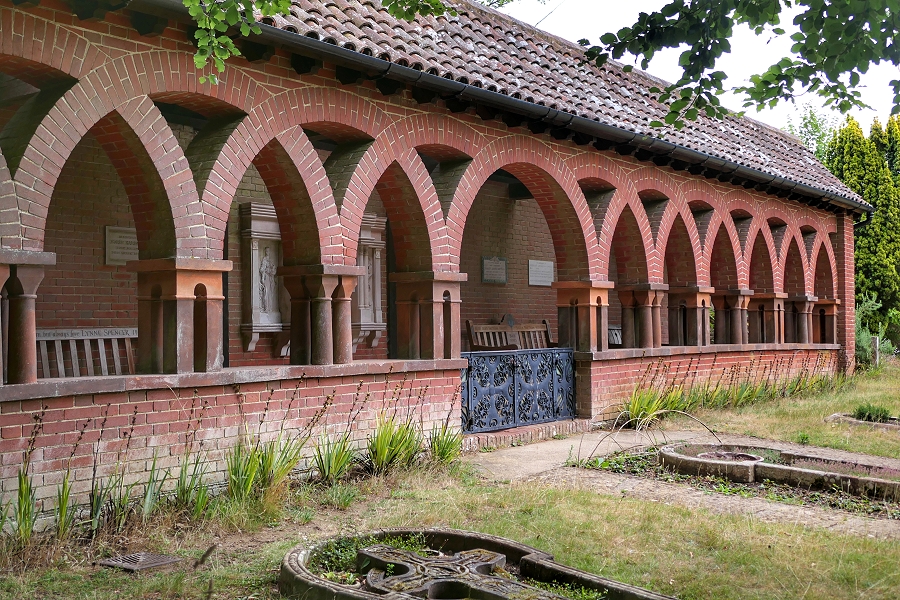Im 'Kreuzgang' oberhalb von Watts Mortuary Chapel befinden sich neben anderen auch die Grabmäler von Mary Seton Watts (1849-1938) und ihrem Mann, dem Maler und Bildhauer George Frederic Watts (1817-1904) ... | |