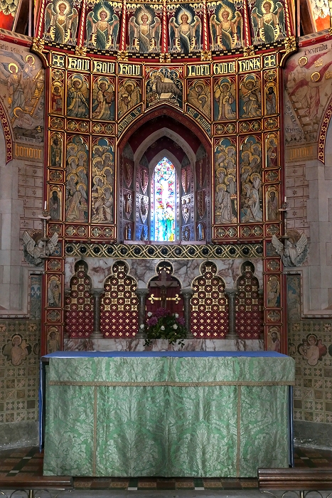 Rund um den Altarausatz im Chor der Kirche St Peter's in Hascombe sind die Heiligen der 19 Kirchen des Dekanats dargestellt ...