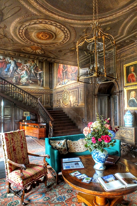 Eingangshalle und Treppenhaus von Hanbury Hall mit bemalten Wänden und Decke ...