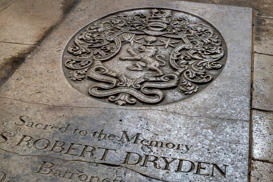 Grabplatte mit Familienwappen für Sir Robert Dryden, 3rd Bart. (1638-1708) in der Kirche von Canons Ashby ...