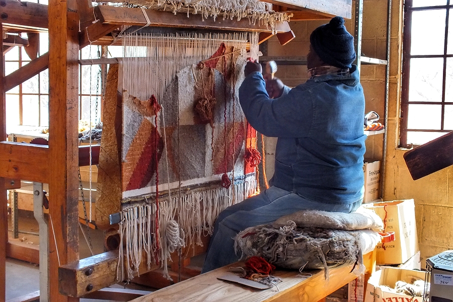 Die gefertigten Teppiche und Wandbehänge tragen Muster, wie sie in Deutschalnd in den 70er Jahren modern waren ...