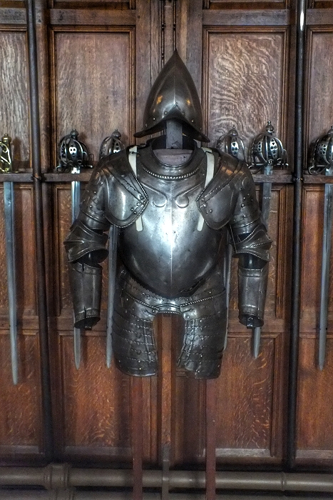 Ritterrüstungen und Handwaffen an den Wänden bilden den dekorativen Rahmen in der Banketthalle von Edinburgh Castle ...